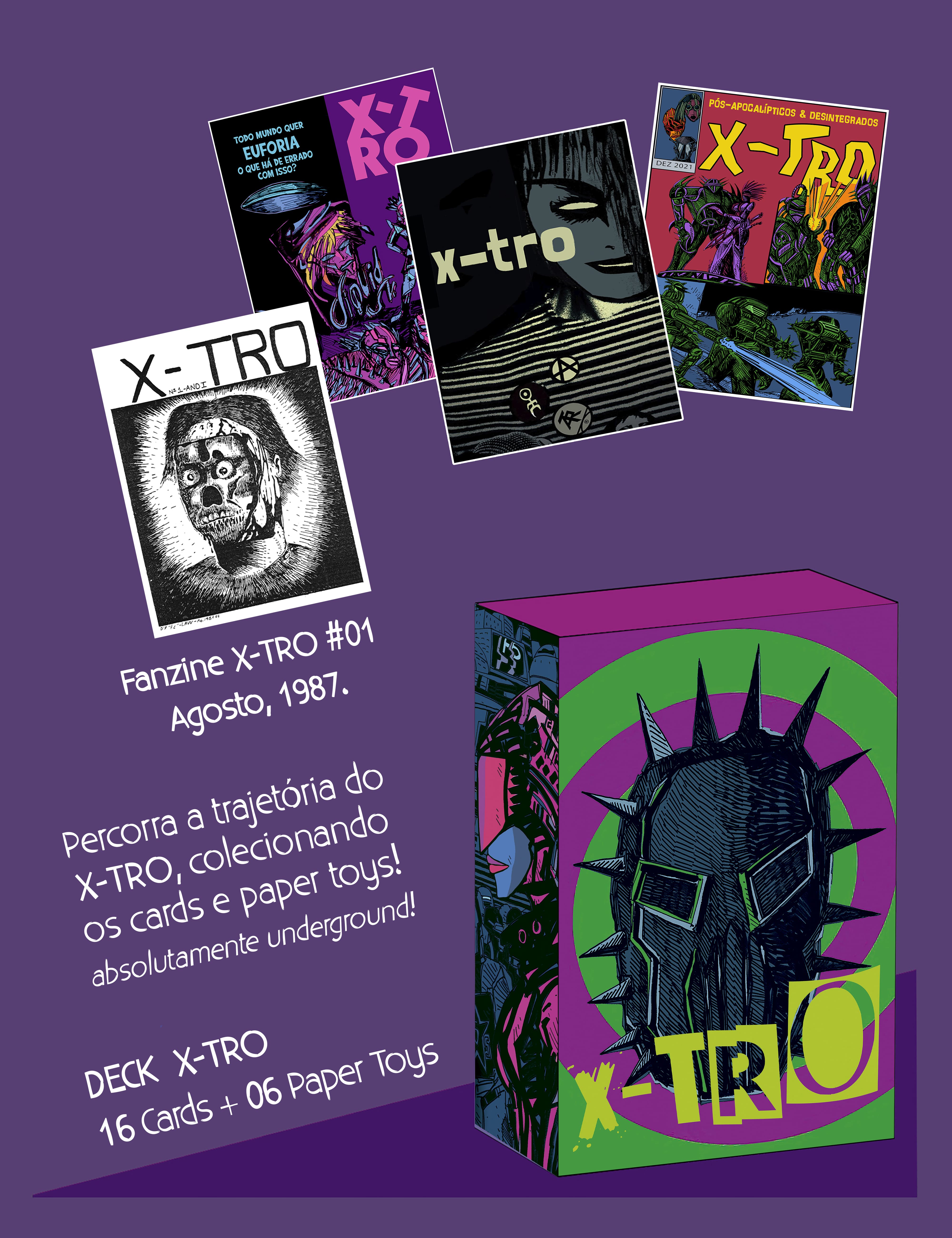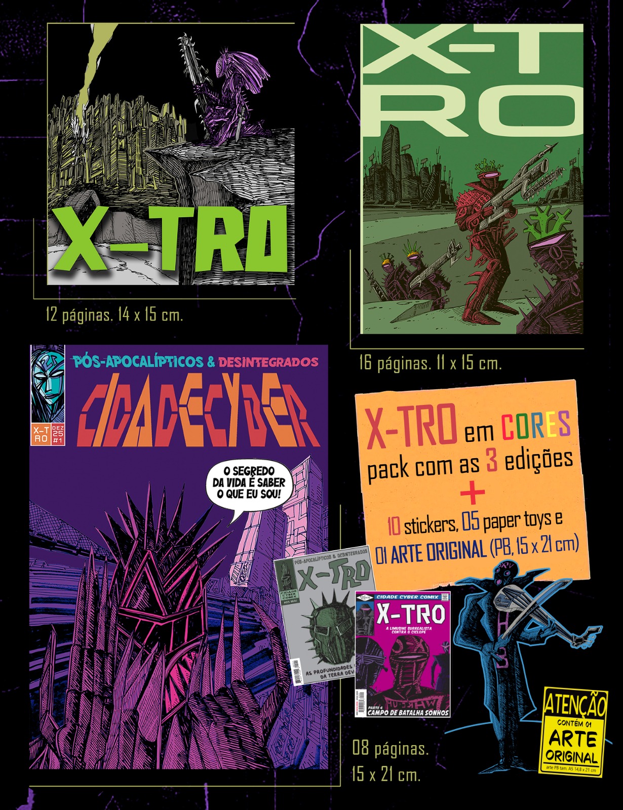 O pack X-TRO contém: 03 edições em cores; 10 stickers; 05 paper toys; 01 Arte Original (P&B, 15x21 cm).