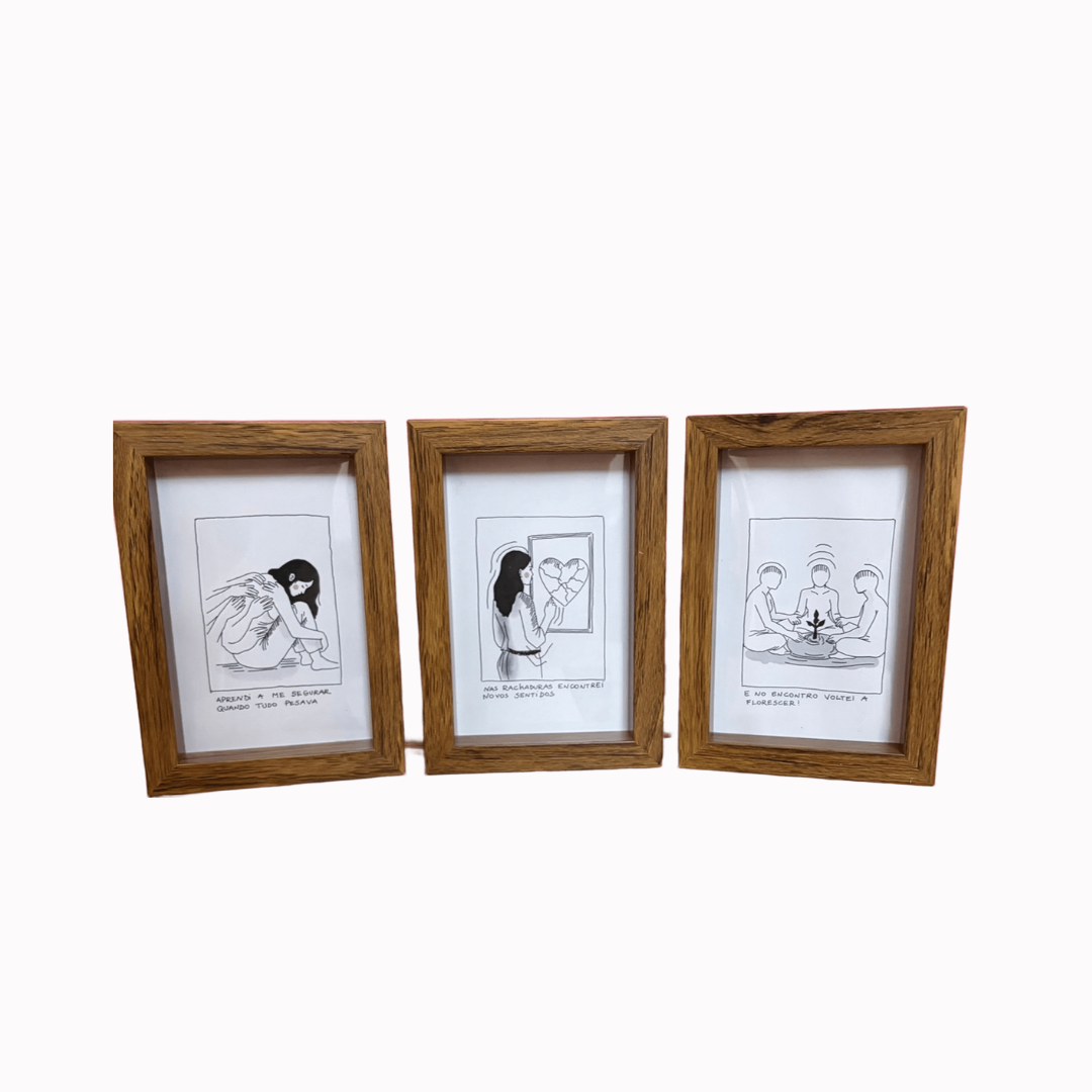 Trio de Quadros com arte autoral da artista Ana Clara Tissot. Já emoldurados. Trio Completo. Dimensões: 10 x 15 cm (já na moldura).