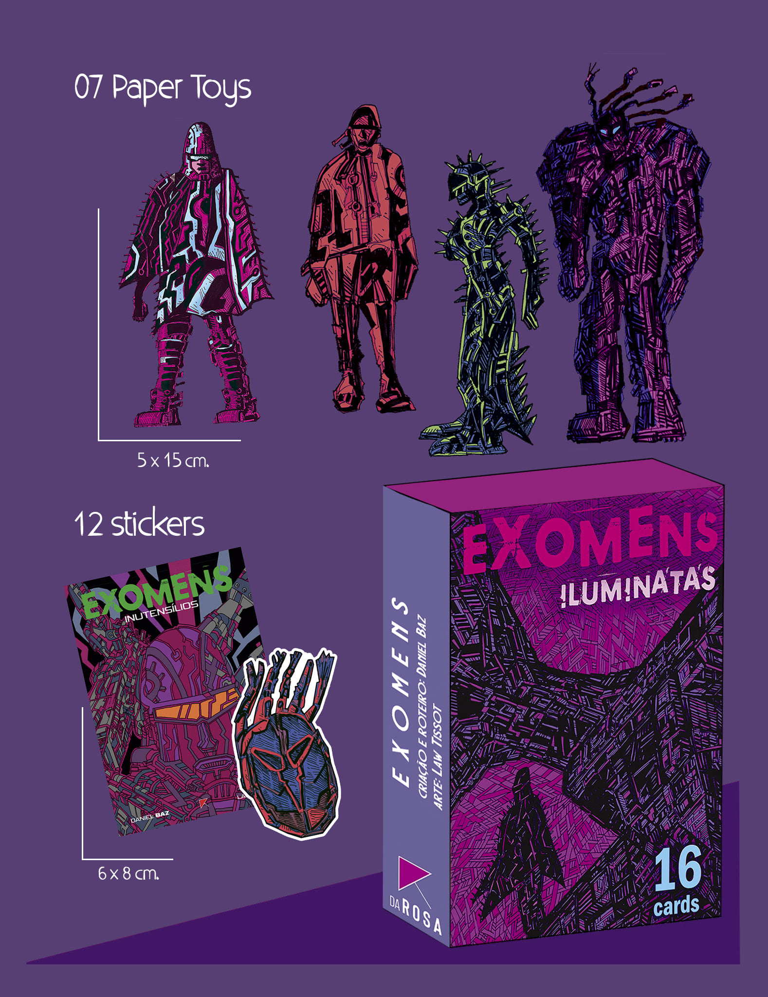 O pack X-TRO contém: 03 edições em cores; 10 stickers; 05 paper toys; 01 Arte Original (P&B, 15x21 cm).