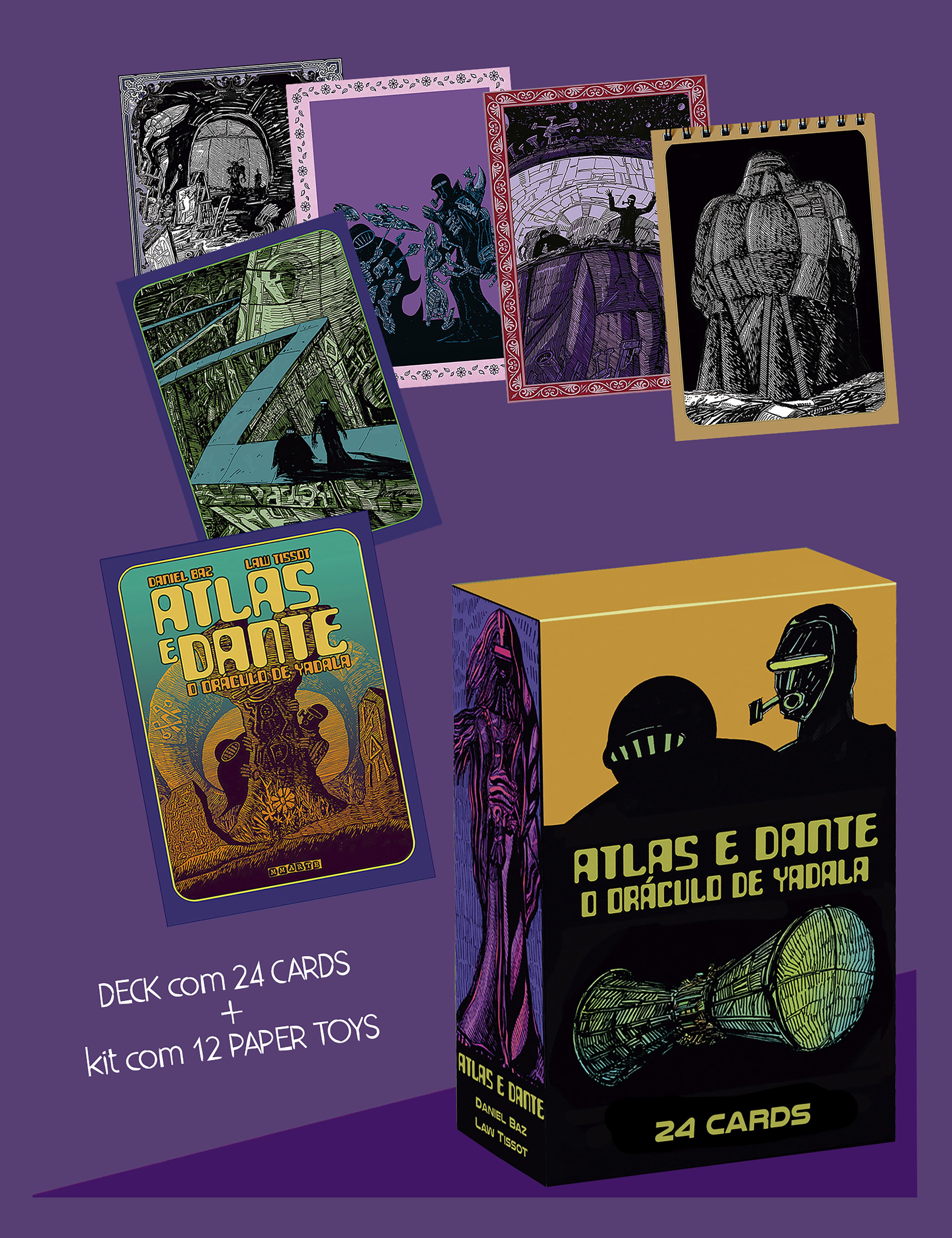 Deck de Cards contém 24 Cards + Kit com 12 Paper Toys de Atlas e Dante: O Oráculo de Yadala! Art by Law Tissot. (on ig @lawtissot) Quantidade e tamanhos: 12 Paper Toys (8x14cm); 24 Cards (7x9cm).